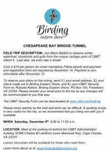 Go on a field trip with Mario Balitbit and explore the fascinating world of winter waterfowl, shorebirds, and gulls — all from the rare vantage point of Island 4 on the Chesapeake Bay Bridge-Tunnel! You never know what you might encounter — last year’s group even spotted a whale on this unique birding adventure!