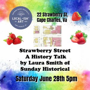 Laura Smith of Sunday Historical will give a presentation on the history of Strawberry Street at Local-ish Art located at 22 Strawberry St. in Cape Charles. Learn about the early businesses, people, and buildings. The event is free and open to the public, 5pm Saturday June 28th. Come early and peruse the beautiful works of art inside the gallery. There is a wide variety of affordable art, jewelry, and pottery available for purchase in the cooperative gallery.