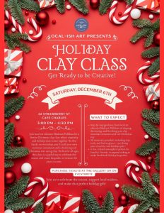 Local art educator Madison Pollihan is coming to Local-ISH Art to lead a clay class! Experience step-by-step guidance as you work to create a snowman ornament and coil Christmas tree out of clay. Open to all ages, materials included in ticket price.