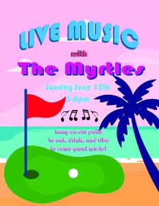 Come groove on our patio this Sunday to live music with The Myrtles from 5pm to 8pm. No need to play mini golf, just relax with some great food and drinks.