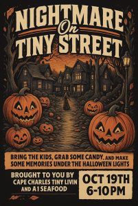 « All Events This event has passed. Nightmare on Tiny Street October 19, 2025 @ 6:00 PM - 10:00 PM « Haunted Mini Golf Locals Night at Ambrogia » Candy, costumes, and Halloween lights await — don’t miss Nightmare on Tiny Street! Add to calendar Google Calendar iCalendar Outlook 365 Outlook Live Details Date: October 19, 2025 Time: 6:00 PM - 10:00 PM Event Category: Social Event Venue Cape Charles Tiny Livin’ 22102 South Bayside Road Cape Charles, VA 23310 United States Phone 757-654-5259 View Venue Website Organizer Cape Charles Tiny Livin’ Phone 757-695-9900 View Organizer Website Related Events Trivia Night & Sushi January 22 @ 6:00 PM - 8:00 PM STL Book Club CC || Anxious People by Fredrik Backman January 22 @ 6:30 PM - 7:30 PM Paint and Sip January 28 @ 3:00 PM - 4:30 PM