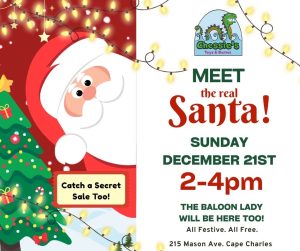 Guess who’s coming to town? The REAL Santa Claus is stopping by Chessie’s Toys & Games with special guest…..the Balloon Lady! — all festive, all free, and full of holiday magic!