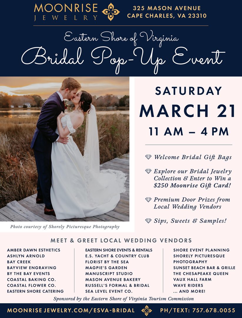 Are you planning an Eastern Shore wedding or just getting inspiration? Mix + mingle with local event vendors, explore our bridal jewelry collection, PLUS enter to win our amazing door prizes!