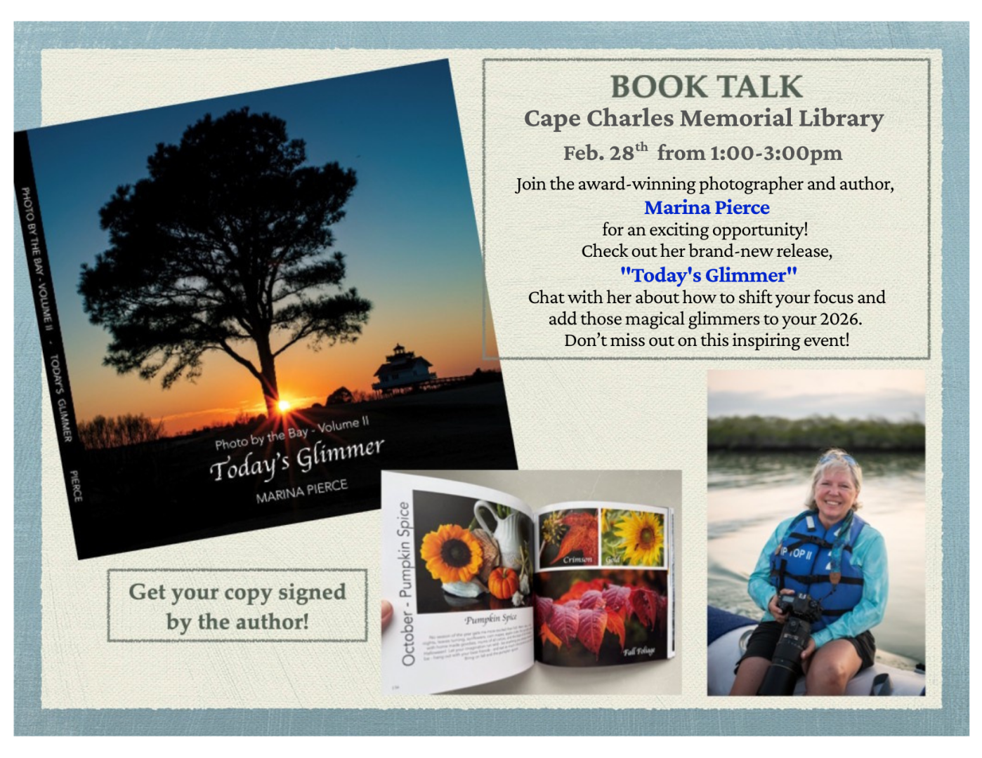 Cape Charles Memorial Library 201 Mason Ave, Cape Charles, VA, United StatesThis Saturday, 2/28 from 1-3pm. Join award-winning photographer and author Marina Pierce. Check out her brand new release "Today's Glimmer" and chat about how to shift your focus and add […]