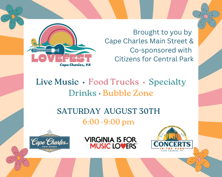 Cape Charles Central ParkJoin us for this year's Lovefest in the park! Get your flower power, tie-dye, and go-go boots ready! Bring a lawn chair or blanket and prepare to boogie at 7p.m. with the English Channel Band! Prizes for Best 60's costume!