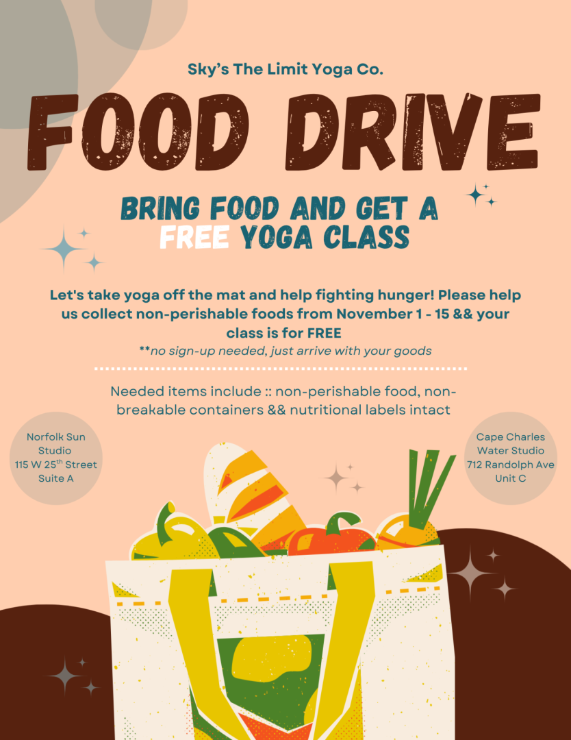 Let's take yoga off the mat and help fight hunger! Please help us collect non-perishable foods from November 1 - 15 & your class is FREE **no sign-up needed, just arrive with your goods What do we need? -Non-perishable food -Non-breakable containers -Nutritional Labels intact