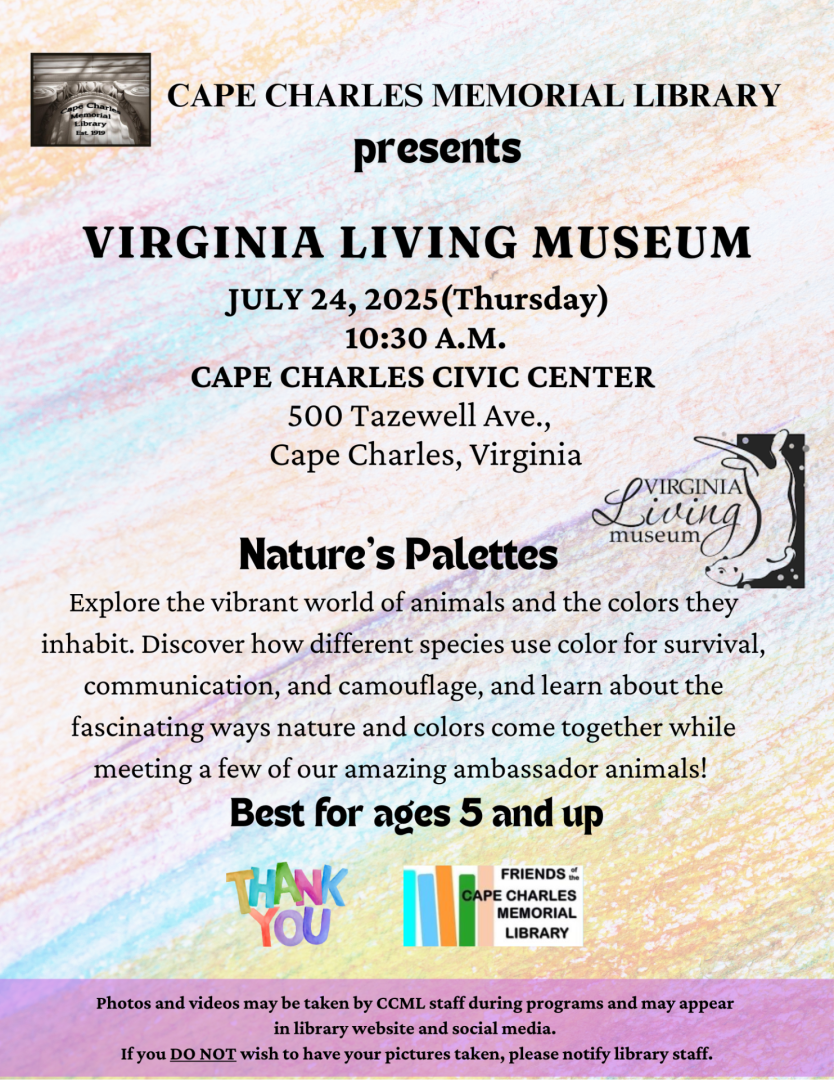 Cape Charles Civic Center 500 Tazewell Avenue, Cape Charles, VA, United StatesDiscover how different species use color for survival and communication. Learn about the fascinating ways nature and colors come together and meet our amazing ambassador animals. Best for ages 5 […]