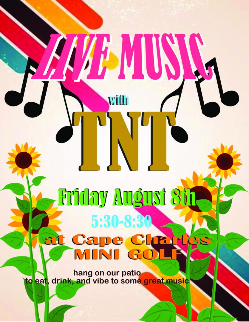 Cape Charles Mini Golf 2100 Stone Rd., Cape Charles, VA, United StatesCome chill on our patio and groove to music by TNT. We will have Maryland crab cakes on special!