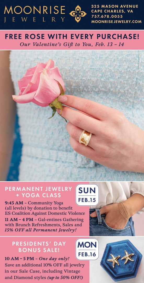 Moonrise Jewelry 325 Mason Avenue, Cape Charles, VA, United StatesWhen :: February 15th || 9:45A Where :: Moonrise Jewelry || 325 Mason Ave, Cape Charles, VA 23310 Cost :: By Donation *A portion of the proceeds will be donated to Eastern Shore Coalition Against Domestic Violence (ESCADV)* Calling all Galentine’s - let’s have some fun + spread some love both on and off the […]