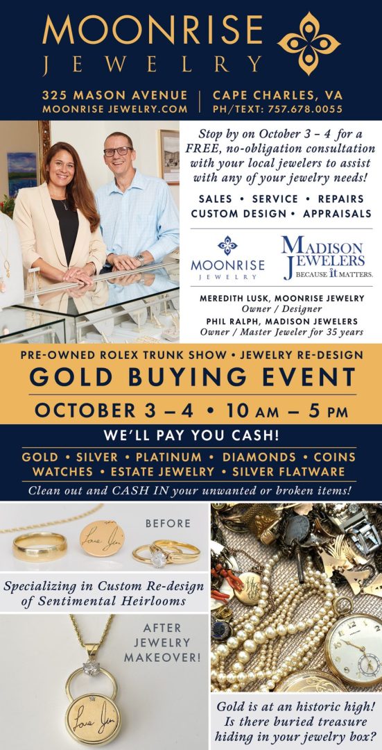 Moonrise Jewelry 325 Mason Avenue, Cape Charles, VA, United StatesCome to Moonrise Jewelry in Cape Charles on October 3 - 4 from 10AM – 5PM for a FREE, no-obligation consultation during our semi-annual Gold Buy, Jewelry Makeover & Rolex Trunk Show ✨ We can help you decide what to sell, what to repair, and what to re-design. No appointment needed! Just bring your items […]